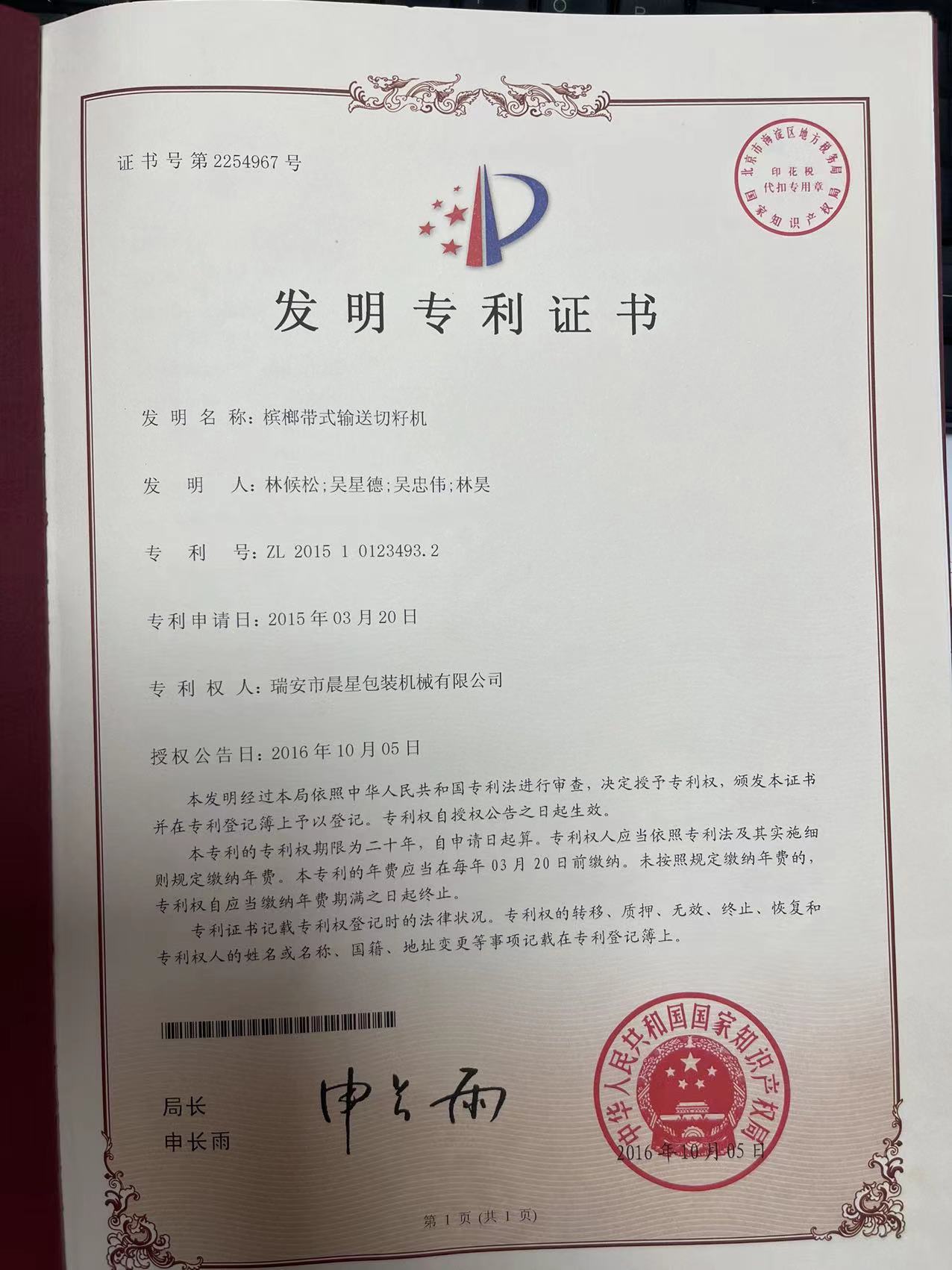 檳榔帶式輸送切籽機(jī)專利證書